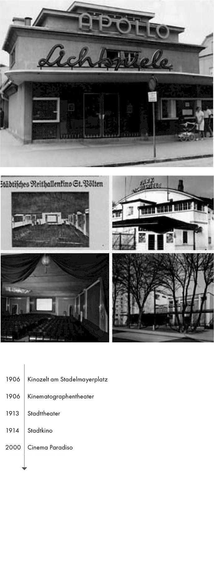 Wer jedoch nun annimmt, es handle sich bei diesem um das erste Kino in St. Pölten, liegt falsch, war doch die Entwicklung, die das Lichtspieltheater in unserer Stadt seit 1906 genommen hat, eine sehr erstaunliche. Annähernd gleichzeitig zur Aufführung im Schützenhaus war es nämlich der St. Pöltner Louis Geni, einer der bekanntesten Wanderkinobesitzer der Monarchie, der in jenen Jahren immer wieder mit seinem Kinozelt am Stadelmayerplatz, dem heutigen Gewerkschaftshausparkplatz, gastierte. Dennoch war es ihm nicht beschieden, das erste gemauerte städtische Kino zu errichten. Während nämlich Geni noch mit seinem Zelt in ganz Österreich und darüber hinaus unterwegs war, bemühten sich bereits einige St. Pöltner um eine Konzession für ein ständiges Kinematographentheater, die allerdings vorerst ebenfalls auf der Stecke blieben, da die Stadt, die gerade zuvor das Stadttheater neu saniert hatte und nun das Kino als zu große Konkurrenz für dessen Betrieb ansah, die Konzession vorerst schlichtweg verweigerte. Erst als man merkte, dass diese Weigerung nichts einbrachte, weil vor den Toren der Stadt, unmittelbar nach der Traisenbrücke im Ortsteil Wagram, das ehemalige Elitekino errichtet wurde, bemühte sich die Stadt selbst um eine Lizenz, wobei man zuerst die Stelle der Baulücke Rathausplatz 2–3 (heute Bank Austria sowie Dorotheum) für ein neues Kino ins Auge fasste, ehe man ein solches vorübergehend im Stadttheater einrichtete. Am 23. März 1913 war es schließlich so weit und man eröffnete mit gleich drei Filmen, darunter der Streifen „Jockey aus Liebe“ mit Max Linder, einem der ersten Kinolieblinge. Kurze Zeit später war der Kino betrieb im Theater fast konkurrenzlos, fiel doch das gerade erst eröffnete Elitekino bereits am 30. August 1913 einem Brand zum Opfer, wobei Brandlegung nicht ausgeschlossen wurde.